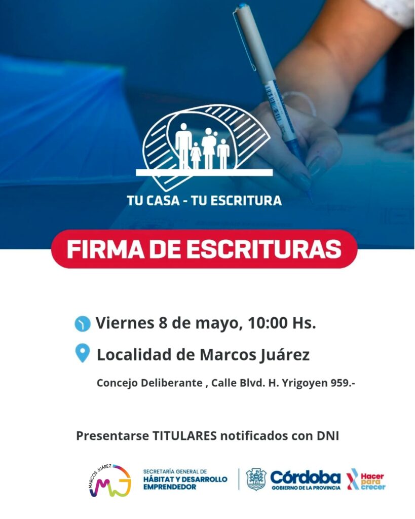 La convocatoria es para el viernes 8 de mayo a las 10 h. Los loteos son: manzanas 58, 108, 109 y 122 del barrio Sur, inmueble del barrio 136 viviendas y manzana 24 del Panal. Los titulares deben presentarse con DNI. En el marco del programa “Tu casa – Tu escritura”, el próximo viernes 8 de mayo a las 10 h, en el Concejo Deliberante de la ciudad de Marcos Juárez, se firmarán nuevas escrituras. Los loteos son los siguientes: