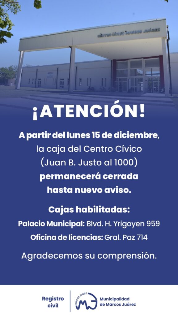 La Municipalidad informa que, desde el lunes 15 de diciembre, la caja ubicada en el Centro Cívico, Juan B. Justo al 1000, permanecerá cerrada hasta nuevo aviso.