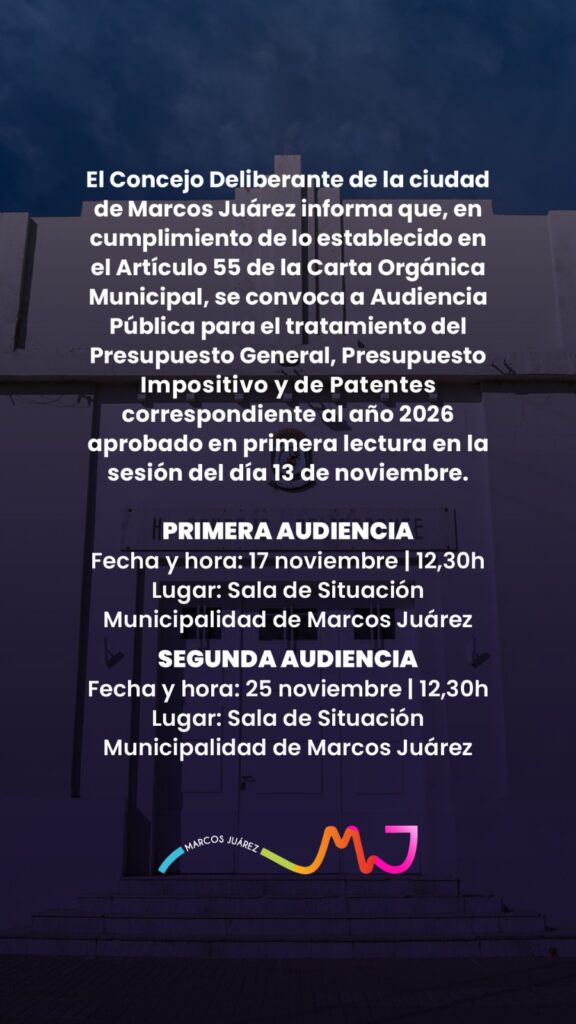 El Concejo Deliberante de la ciudad de Marcos Juárez informa que, en cumplimiento de lo establecido en el Artículo 55 de la Carta Orgánica Municipal, se convoca a Audiencia Pública