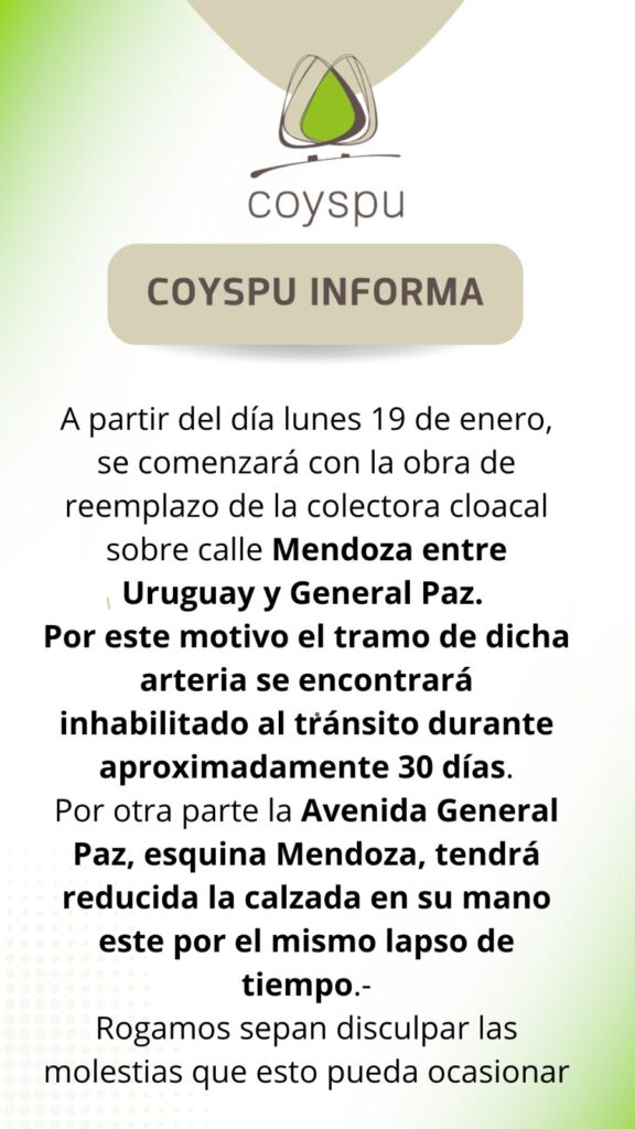 Así lo informó COYSPU. El motivo es la obra de reemplazo de la colectora cloacal. Por otro lado, Gral. Paz, esquina Mendoza, tendrá reducida la calzada en su mano este
