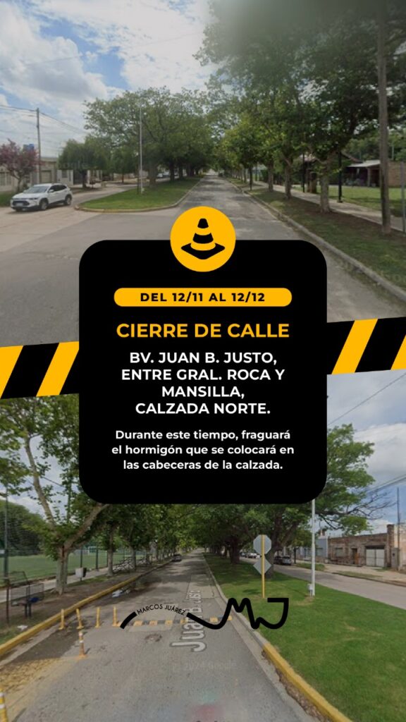 La Municipalidad de Marcos Juárez informa que a partir del miércoles 12 de noviembre, la calle Juan B. Justo permanecerá cerrada al tránsito entre Gral. Roca y Mansilla, calzada norte, durante aproximadamente un mes.