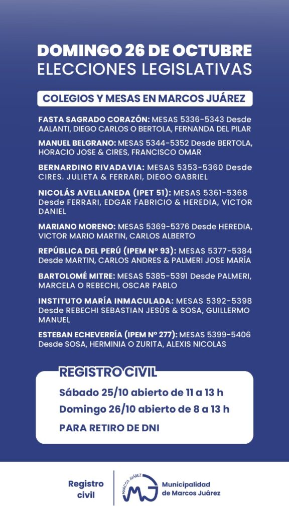 El próximo domingo 26 de octubre habrá elecciones legislativas en todo el país. En Marcos Juárez están confirmados los colegios y las mesas.