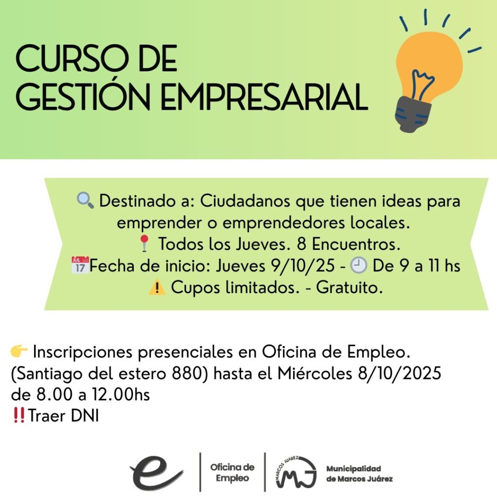 El próximo jueves 9 de octubre comienza un nuevo Curso de Gestión Empresarial en la Oficina de Empleo de Marcos Juárez.