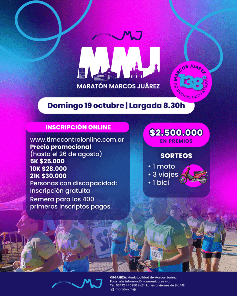 La Municipalidad de Marcos Juárez, a través de la Dirección de Deporte, junto a la Comisión de Deporte de la ciudad, informaron que el próximo domingo 19 de octubre será la Maratón 138° aniversario.