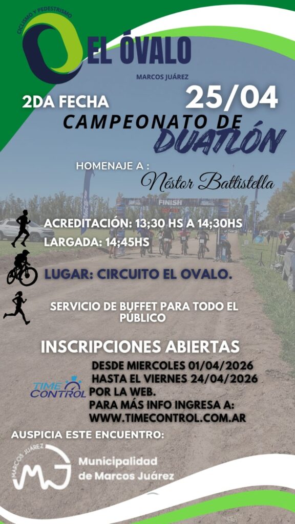 El grupo de Ciclismo y Pedestrismo «El Óvalo», junto al apoyo de la Municipalidad de Marcos Juárez, realizan el próximo sábado 25 de abril la segunda fecha del Campeonato de Duatlón 2026.