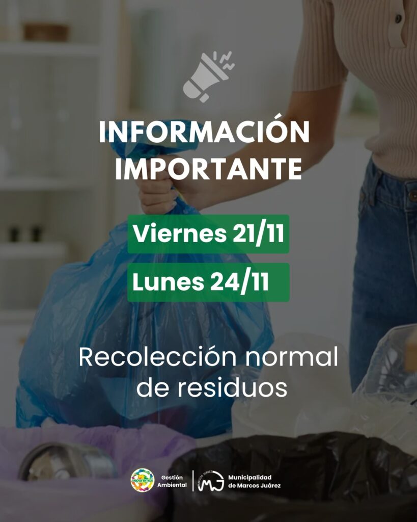 El Área de Gestión Ambiental de la Municipalidad de Marcos Juárez informa que la recolección de residuos se realizará con total normalidad el viernes 21 y el lunes 24 de noviembre.