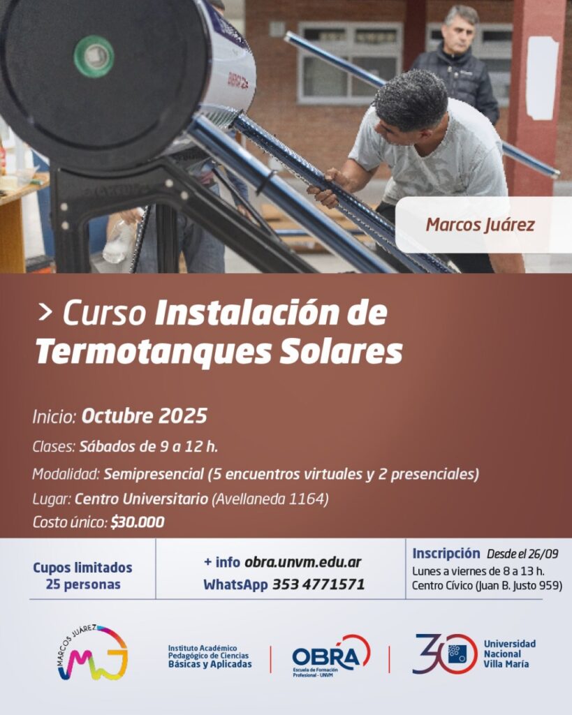 La Municipalidad de Marcos Juárez, junto al Instituto Académico Pedagógico de Ciencias Básicas y Aplicadas, la Escuela de Formación Profesional UNVM y la Universidad Nacional de Villa María, realizarán un nuevo Curso de Instalación de Termotanques Solares en la ciudad.