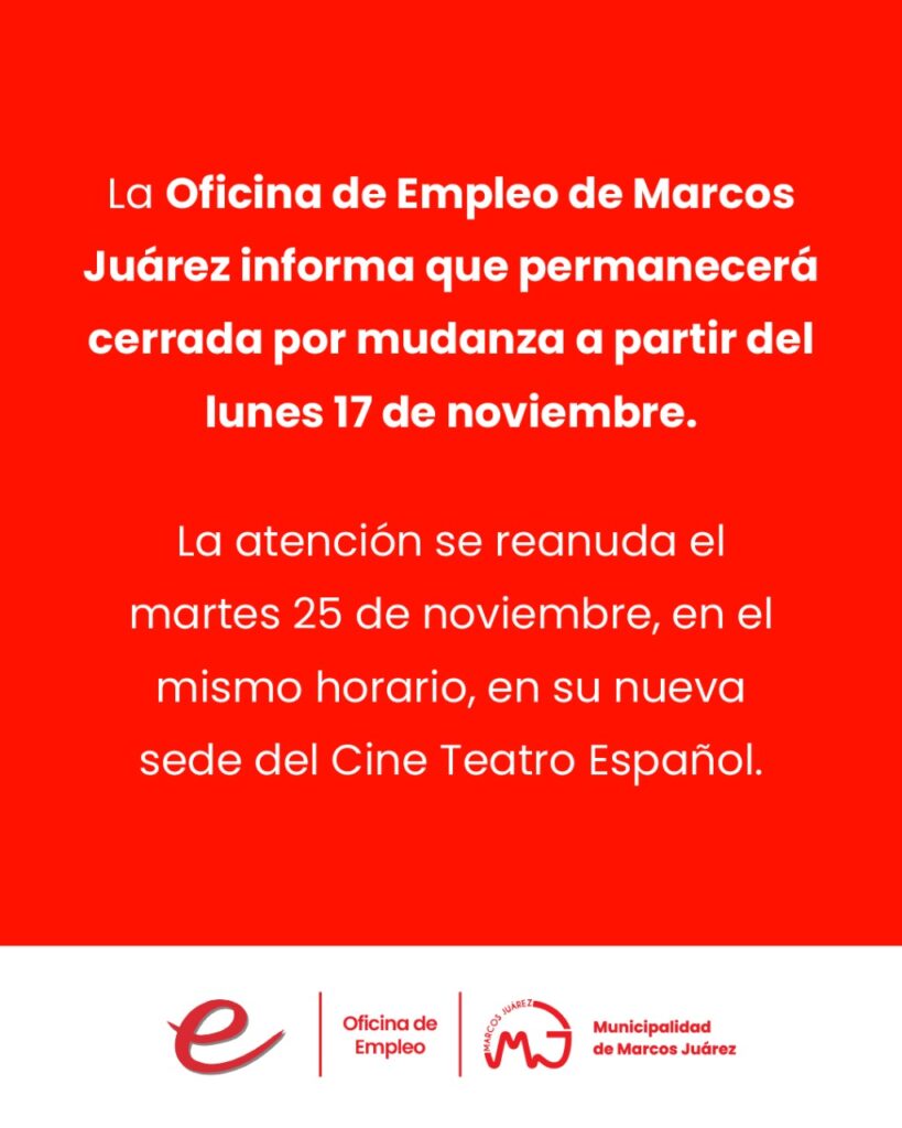 La Oficina de Empleo de Marcos Juárez informa que permanecerá cerrada por tareas de mudanza a partir del lunes 17 de noviembre.