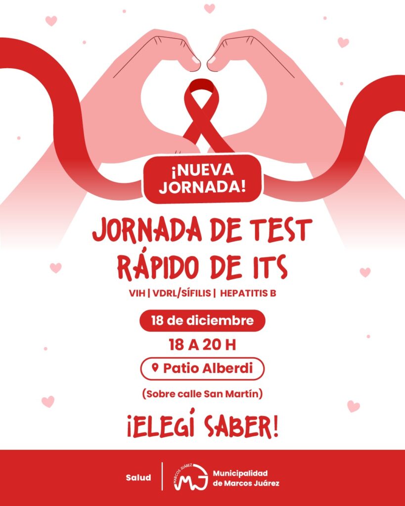 La Municipalidad de Marcos Juárez, a través de la Secretaría de Salud, informa que el jueves 18 de diciembre, de 18 a 20 horas, se realizará en el Patio Alberdi una nueva jornada de tests rápidos de ITS.