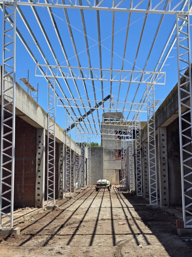 En esta etapa se está colocando el techo en todo el sector principal, un progreso fundamental que permitirá continuar con mayor velocidad el resto de las tareas. De manera simultánea, equipos especializados llevan adelante el movimiento y nivelación del suelo, preparando la base para intervenciones posteriores.