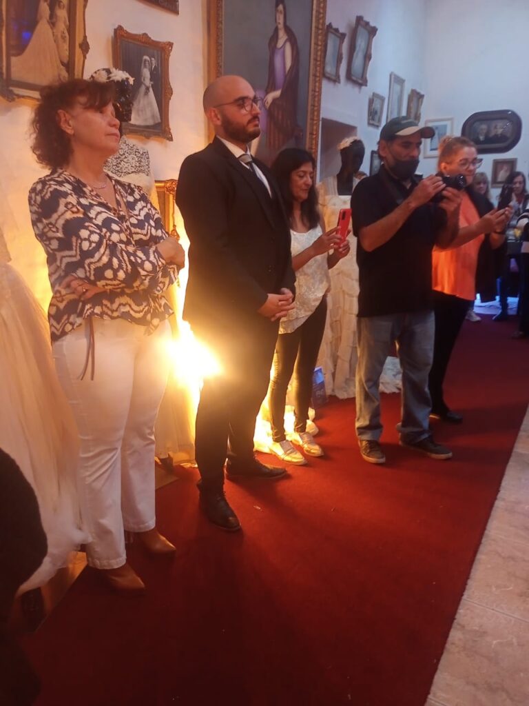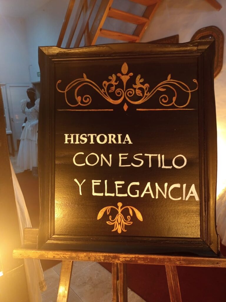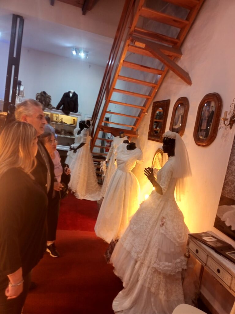 La exposición presenta una cuidada selección de vestidos de 15 años, trajes de casamiento, prendas históricas, bijouterie y otros objetos que reflejan el paso del tiempo y las tradiciones de la comunidad.